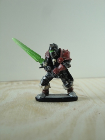 Eine weitere sehr schöne Figur von Grenadier. Um das Schwert in dieser Form zu bemalen sind sehr viele verschiedene Schichten immer heller werdender Farbe nötig. Man grundiert weiss und beginnt mit verdünntem Dunkelgrün.